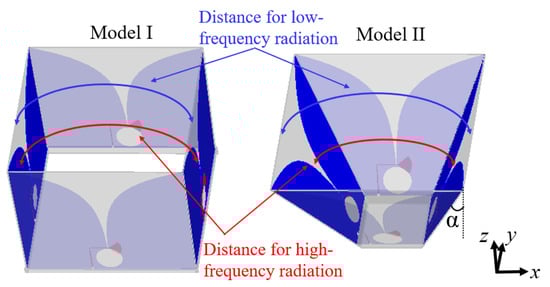 As the two Vivaldi elements with the same polarization are placed facing each other and are excited simultaneously, an array factor is included for the combined radiation pattern. A fixed distance between two Vivaldi elements that is suitable for low frequencies would result in a high sidelobe level at high frequencies and a low directivity. One unique feature of the Vivaldi element is that the EM waves radiate from a wide area of the open slot at low frequencies and from a narrow area of the slot at high frequencies. Utilizing this feature, we arranged the elements at an oblique angle of α to reduce the distance between radiating surfaces at high frequencies while having minimal impact on the larger distance required at low frequencies, as illustrated in Model II in Figure 3. In this way, with a given angle α, the directivity at certain high frequencies can be improved with a lower sidelobe. Here we need to note that the tapered or curved surfaces can be used to optimize the spacing between the Vivaldi elements to provide better directivity enhancement over a broad bandwidth. However, for ease of fabrication, a straight surface is considered.