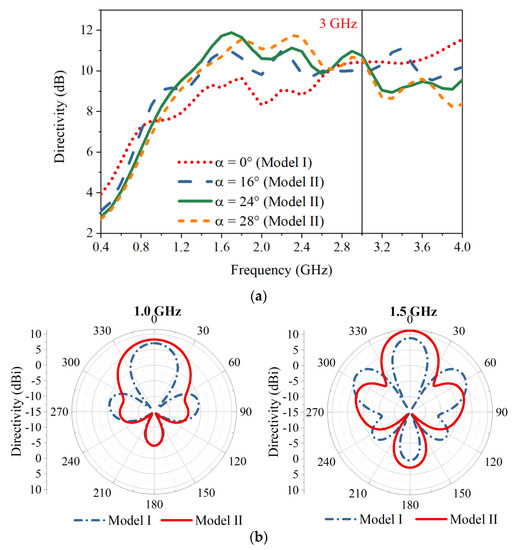 The antenna directivity of the vertically arranged configuration (Model I, where α = 0°) and the obliquely arranged configuration (Model II, with different oblique angle α) is compared in Figure 4a. Across the band of interest for the GPR application (0.4–3.0 GHz), the directivity of Model I increases with frequency and has a peak value of 10 dB at 3.0 GHz. Compared with the directivity of Model I, by obliquely arranging the Vivaldi elements, the directivity of Model II is increased noticeably at frequencies above 0.8 GHz. A larger α in Model II enhances the directivity at a higher frequency band, but slightly reduces the directivity at low frequencies. In order to maintain a high average directivity across the band of interest, α in the design is chosen to be 24°. This leads to a maximum directivity increment of 2.7 dB with a peak value of 11.9 dB at 1.6 GHz. The performance at lower frequency is slightly compromised with a decrease in the directivity of less than 1 dB. For frequencies higher than 3.0 GHz, the directivity of Model II is lower than that of Model I due to the limited influence of the oblique arrangement in the distance between the radiating areas at these frequencies. The distance is still very large in terms of wavelength, which results in high sidelobe levels and reduced directivity. Nevertheless, the maximum directivity of Model II maintains an acceptable level of 9 dB for frequencies higher than 3.0 GHz.