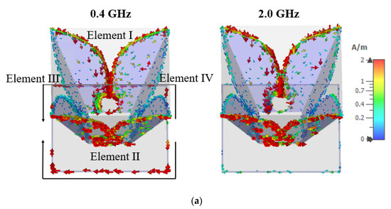It can be observed in Figure 4a that the directivity at low frequencies is much lower than that at high frequencies. Planar or cavity reflectors can be effective options to improve the directivity at lower frequencies [25,26], but reflections from a large metallic reflector will give rise to unwanted ringing effect and result in waveform distortion, which is undesirable for GPR applications [27]. In this work, a thin square metallic loop is implemented as a reflector to improve the directivity at low frequencies while minimizing its impact on the antenna dispersion. The configuration of the loop reflector is shown in Figure 1c. The circumference of the metallic loop is 840 mm, which is slightly larger than a wavelength at 0.4 GHz. The current distributions on the antenna at 0.4 GHz and 2.0 GHz when elements I and II are excited are illustrated in Figure 5a. At 0.4 GHz, a large amount of current is induced on the thin square loop, forming two current paths. The length of each current path is approximately λ/2 at 0.4 GHz. The radiation from this current is combined with the radiation from the elements I and II, leading to an enhancement in directivity by 3.4 dB, as shown in Figure 5b. For current distribution at higher frequencies such as at 2.0 GHz, small currents are observed on the square loop, so the loop reflector has minimal impact on the radiations at high frequencies, as shown in Figure 5b. The directivity of the antenna with and without the loop reflector is compared in Figure 5c. The existence of the reflector increases the directivity from 0.4 GHz to 0.9 GHz, with a maximum increment of 3.4 dB at 0.4 GHz.