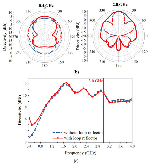 (a) Current distribution on the antenna with the loop reflector at 0.4 GHz and 2.0 GHz; (b) comparison of radiation patterns with and without the square loop reflector at 0.4 GHz and 2.0 GHz; and (c) antenna directivity from 0.4 GHz to 4.0 GHz.