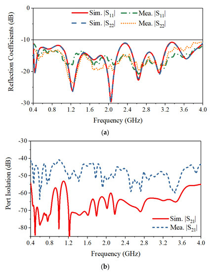 Simulated and measured (a) reflection coefficients, and (b) port isolation.