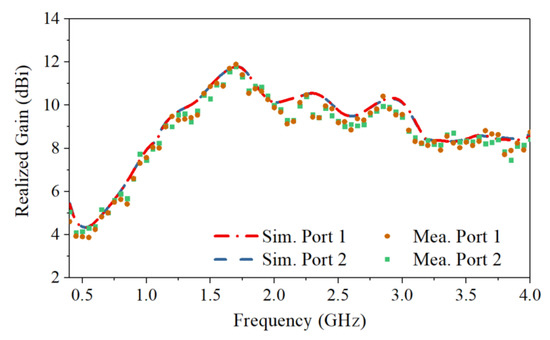 The S-parameters obtained by simulation and measurement are shown in Figure 7. The measured reflection coefficients of the two ports are in good agreement with the simulated ones. The measured operating frequency is from 0.4 GHz to 4.0 GHz with reflection coefficients lower than −10 dB. Across the band, the measured port isolation is more than 40 dB, as shown in Figure 7b. The isolation is calculated using the S4P parameters of the antenna with an ideal power divider to eliminate the impact of the imbalance of the real divider. The discrepancy between the simulated and measured port isolations can be caused by the fabrication tolerance and imperfect soldering. The normalized simulated and measured radiation patterns for horizontal polarization in both the E- and H-planes are shown in Figure 8. The results for the vertical polarization are identical to those for the horizontal polarization due to the symmetrical configuration of the antenna. As shown in Figure 8, the measured radiation patterns are in good agreement with the simulated ones, and both show directive radiation with cross-polarization discrimination (XPD) higher than 23 dB at boresight. The XPD is calculated by . The antenna has a measured gain that varies from 4 dBi to 12 dBi, as presented in Figure 9. The total efficiency of the antenna is more than 82% across the operating band, as shown in Figure 10.