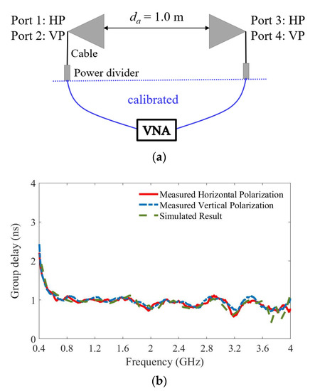 In the frequency domain, the dispersion is evaluated by the group delay, which represents the delay of the amplitude envelopes of a signal at various frequencies through the antenna. A constant group delay is required to guarantee minimum distortion of a signal. The group delay of the proposed Vivaldi antenna is measured by placing two antennas face to face at a distance of 1.0 m, as illustrated in Figure 11a. As the antenna has two polarizations, the group delays in both cases are examined. S31 and S42 are measured and their phase components are extracted as