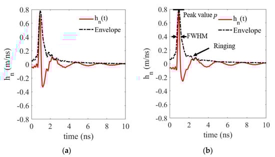 In the time domain, the ringing effect can be quantified by the transient response of the antenna. The antenna’s transient response is defined by modeling the antenna as a linear time-invariant transmission system with excitation voltage and radiated field strength as input and output parameters, respectively [28]. The duration of the ringing in the transient response should be less than a few multiples of the duration of its main pulse for an impulse ultra-wideband antenna.