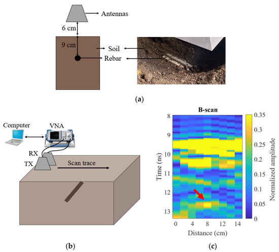 Figure 13c shows the measured B-scan after applying background removal. The rebar was visible as a hyperbolic shape starting at 12.5 ns. The reflected signal from the soil surface was located at 9.2 ns. The calculated depth based on the measured time delay difference between the reflected signals from the soil surface was 9.3 cm. The speed of EM waves in soil used in the calculation was . The slight difference between the calculated depths and the real depths could be caused by the heterogeneous soil media with inconsistent permittivity. The noise in the images came from the reflections from the rough soil surface, embedded stones, and wet clods in the true soil environment [33], as well as reflections from the surrounding environment. Signal processing techniques are being investigated to improve the image quality further.