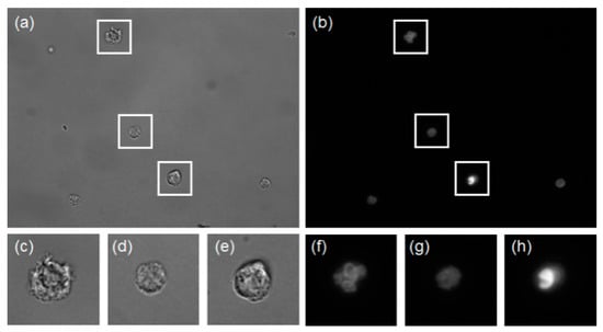 White blood cells (WBC) images taken by microscope (a) bright-field WBC images, (b) the corresponding fluorescent WBC images, (c–e) bright-field granulocyte, lymphocyte, and monocyte images, (f–h) the corresponding fluorescent granulocyte, lymphocyte, and monocyte images.