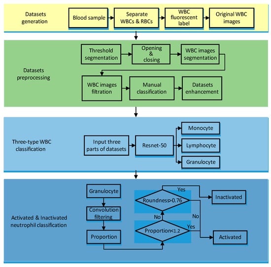 White blood cells (WBCs) are important immune cells in the human body, which are mainly involved in immune response and regulation of inflammation [1]. The three-type differential count of WBCs, i.e., monocyte, lymphocyte, and granulocyte, provides an important indication for the diagnosis of many diseases, such as leukemia [2,3] and cancers [4]. As the dominant fraction of granulocytes, neutrophils usually show an abnormal change in the expected number when dealing with damaged tissues and unresolved infections [5]. The transition from an inactivated state to an activated state is a basic condition for neutrophils to function as immune cells. Therefore, the rapid classification and counting for activated and inactivated neutrophils based on the three-type WBC classification can provide an important reference for human immune state monitoring.