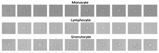 After threshold segmentation, the open operation and close operation were performed on the WBC images to make the cell contour clear. Then the cell images were segmented after determining the specific coordinates of the cell according to the cell contour. We screened the segmented WBC results to eliminate the cells on the edges or multiple adhesions to ensure that there was only one WBC in the center of an image, which is more favorable for the extraction of WBC feature values. After that, WBCs were classified manually according to their corresponding fluorescent labels, and finally, three types of WBC datasets (granulocyte, lymphocyte, monocyte) were achieved. Among them, granulocytes include basophil, neutrophil, and eosinophil. The datasets after segmentation are shown in Figure 3.