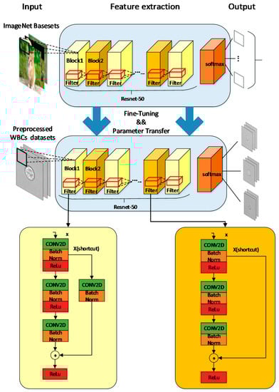 In this paper, we used WBC image datasets, including 10,400 Monocytes, 10,392 Lymphocytes, and 10,266 Granulocytes. Among them, 80% of the WBC image datasets were used as the training set, while 20% were used as the testing set. The whole processing flow is shown in Figure 2. The Resnet-50 network was used in our task for transfer training [21], whose structure included two basic blocks, as shown in Figure 4. Resnet-50 network adds a residual unit through a short connection system.