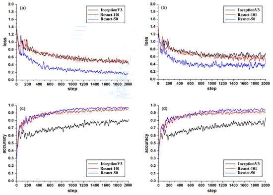 Comparison results of Loss and Accuracy during training and testing for Inception V3, Resnet-101, and Resnet-50: (a) is the training loss, (b) is the testing loss, (c) is the training accuracy, and (d) is the testing accuracy.