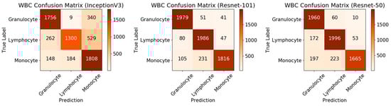 From the comparison of the loss values of the training set and the testing set in Figure 5a,b, it can be seen that the loss value of the Resnet-50 model was the lowest. In the accuracy comparison of the training set and testing set of Figure 5c,d, although the accuracy of Resnet-50 and Resnet-101 was almost the same, it can be seen from the comparison value of the three models in Figure 6 that the F1_score of Resnet-50 was the highest, which proved that the overall performance of Resnet-50 was better than the other two models. In addition, the 95% confidence interval of the Resnet-50, Resnet-101, and InceptionV3 are shown in Table 3. The fluctuation of Resnet-50 () was less than the Resnet-101 () and the InceptionV3 (), which proved that the accuracy of Resnet-50 was more stable than the other two models. It can also be seen in the comparison of the ROC curve as in Figure 7 that the curve of Resnet-50 was the closest to the (0,1) point. The straight-line y = x in Figure 7 represents the result of a classifier using a random guessing strategy. It can be seen that the Resnet model was on the ROC curve above the y = x straight line, which proves that the Resnet model was better than the randomly guessed classifier. The reason for the poor performance of the InceptionV3 model could be that there is no residual network structure in the model and the feature value extraction is not accurate enough. Resnet-101 is deeper than Resnet-50, but the loss value was not lower than Resnet-50, and the value of F1_Score and AUC were not better than Resnet-50, indicating that increasing more layers may not be effective. From the data of the confusion matrix in Figure 8, it can be seen that the classification accuracy of granulocyte (95.6%) and lymphocyte (94%) were high, while the monocyte (84.3%) was low. It indicated that the characteristics of monocyte cells after training were not very obvious and were easily misidentified as lymphocytes. The above results prove that it is feasible to use the Resnet-50 network with a pre-training model to realize a three-type classification for WBCs.