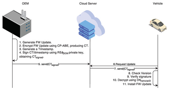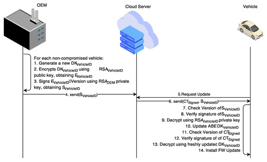 Furthermore, in the case one or many decryption keys are compromised, the manufacturer also provides new keys to the non-compromised vehicles. To do so, the manufacturer generates a new CP-ABE decryption key for each non-compromised vehicle, encrypt said key using the vehicle’s RSA public key, and signs the ciphertext while using its RSA private key. Subsequently, the manufacturer stores the encrypted and signed decryption key (from now on, the key update) in the cloud server. If a new decryption key has been released for a vehicle, when such a vehicle requests a software update, the cloud server also sends to it the key update. In this case, the UCM first verifies the signature on the key update, and then retrieves the new CP-ABE decryption key while using RSA decryption. Finally, the UCM verifies the signature on the software update and decrypts it using the new CP-ABE decryption key. Figure 2 depicts such interactions.