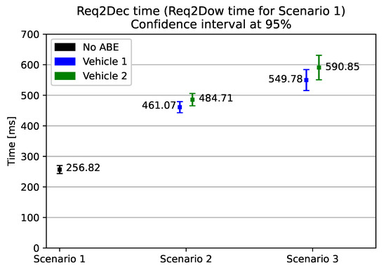We show, in Figure 4, the results of our experiment. The results of scenario 1’s evaluation show us that the download time and the verification of the RSA signature takes about 256 ms. The introduction of only CP-ABE decryption in scenario 2 increases by 200–230 ms the time elapsed from the request of the update to the starting of the installation. This increase in time is due to CP-ABE decryption and the CP-ABE ciphertext overhead download. From the graph, we can see that Vehicle2 spends, on average, about 24 ms more than Vehicle1. Indeed, in order to decrypt the CP-ABE ciphertext, in Vehicle2 the attribute used to decrypt the policies are 2 (i.e., CAR_MODEL_21 and ECU_MODEL_2248), whereas Vehicle1 only has 1 (i.e., ECU_MODEL_2247). Finally, in scenario 3, we see that the additional seldom retrieval of a new decryption key costs, on average, 90–105 ms, in the case of a revocation frequency of once every six updates, which translates to a revocation every 15 days. Moreover, Figure 5 shows that, for a wide range of revocation frequencies, the impact of CP-ABE decryption and key update is limited. Even at the higher measured frequency—once every two updates, or once every five days—the download, key update, and the decryption processes are all performed in just under 675–710 ms. If the revocation frequency drops to once every 12 updates (roughly, once a month), the entire process takes between 518–535 ms.