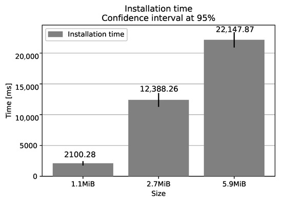 Analyzing the results of the time spent in scenarios 2 and 3 as compared to the time spent in scenario 1, it seems that CP-ABE has a non-negligible impact on the OTA SW update process. However, when we compare these results to the time actually spent on the installation of the SW, we can see that the time increase due to CP-ABE is negligible. Indeed, we also investigated the size of a software update in the automotive scenario. We found out that, typically, an update’s size for a Tesla “Model 3” is about 100 MB [34]. In order to replicate the installation process, we chose to install installation packages of different sizes on the ZCU102. Namely, we measured the installation time for programs with sizes of ∼6.9 KiB, ∼2.7 MiB, ∼5.9 MiB, as shown in Figure 6. We did not perform tests of greater SW size for two reasons: (i) we had difficulties to find programs with the size around 100 MB; and, (ii) even with such small sizes, the installation times are already orders of magnitude greater than decryption and download time. Figure 6 shows that the software of size ∼6.9 KiB, ∼2.7 MiB, ∼5.9 MiB took, on average, 2100 ms, 12,388 ms, and 22,148 ms, respectively.