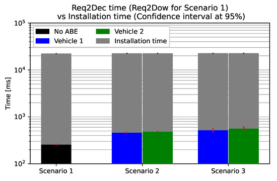 In Figure 7, we can see how much time it takes for each scenario from the update request to the end of the update installation. We had to use the logarithmic scale in order to see the CP-ABE impact, since, when considering the installation time, the three scenarios are practically equivalent. In fact, the average time spent on the 5.9 MiB SW update is 22,148 ms with a 95% confidence interval of ms. This means that the SW installation time is two orders of magnitude greater than all of the previous time computed in the three presented scenarios. Therefore, we can conclude that the time impact of CP-ABE is negligible when also considering that we measured the installation times on SW images that are way smaller of the ones deployed in reality.