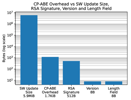 Furthermore, we also considered the impact of CP-ABE in terms of message size. Figure 8 shows the size of the single components of the update message that the cloud sends to the vehicle. The main three fields of such a message are: (i) the symmetrically encrypted SW update (5.9 MiB); (ii) the CP-ABE ciphertext containing the symmetric key; and, (iii) the RSA signature of the OEM. When compared to the RSA signature, the CP-ABE ciphertext amounts to over three times the size. However, compared to the actual software update size, the impact of the CP-ABE ciphertext is so negligible that, in order to show them both in the same graph, we have to use a logarithmic scale.