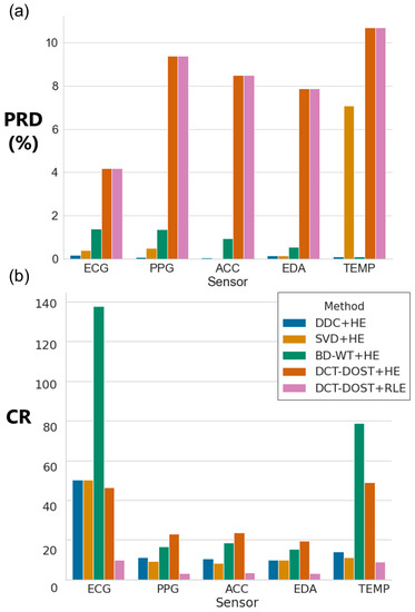 Comparison of (a) PRD and (b) CR for each method across the wearable sensors ECG, PPG, accelerometry (ACC), electrodermal activity (EDA), and skin temperature (TEMP).