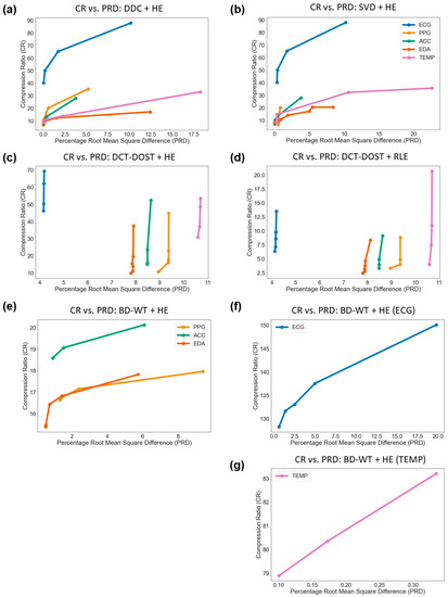 Compression ratio vs. PRD for each data compression pipeline evaluated: (a) Direct data compression (DDC) + Huffman encoding (HE), (b) singular value decomposition (SVD) + HE, (c) discrete cosine transform (DCT)-based discrete orthogonal Stockwell transform (DCT-DOST) + HE, (d) DCT-DOST + run-length encoding (RLE), (e–g) biorthogonal discrete wavelet transformation (BD-WT) + HE. The BD-WT + HE pipeline plot is broken down by sensor type due to the large-scale differences of the TEMP (g) and ECG (f) compression ratios.