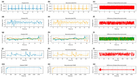 Comparison of original, reconstructed, and difference between original and reconstructed signals for ECG (a–c), PPG (d–f), ACC (g–i), EDA (j–l), and TEMP (m–o). These plots were constructed for the method that minimized the PRD: DDC with HE for ECG, PPG, ACC; SVD with HE for EDA; BD-WT with HE for TEMP. This figure enables visualization of the signal characteristics and corresponding differences between original and reconstructed signals.