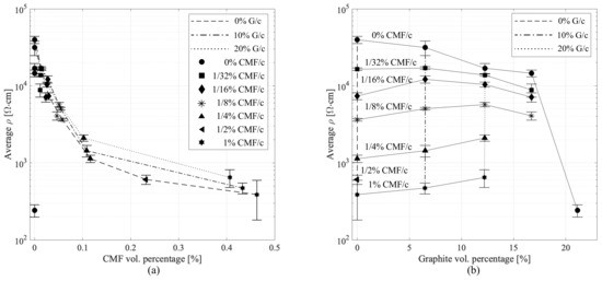 Resistivity measurements were taken 30 days after fabrication on unloaded samples (), following [17] for consistency. Results are plotted in Figure 5, showing the average and the maximum/minimum values under each doping levels arranged by volumetric fractions of G and CMF (Figure 5a).