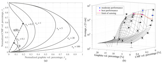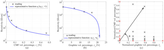 The analytical representation of the resistivity as a function of both inclusions was expected to be a nonlinear interpolation function in polar coordinates (v,) defined in the positive part, where is the angle between the line connecting the data point to the origin and the horizontal axis as illustrated in Figure 6c. Here, the extreme value denotes G-only samples, and denotes CMF-only samples. The radial component is taken as and the angular component . The interpolation is conducted by introducing an angular variable . is a continuous function over that enables the nonlinearity of the interpolation. The surface function characterizing becomes: