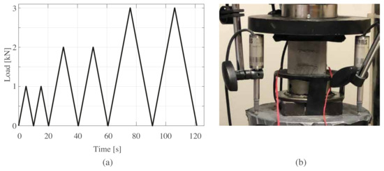 (a) The load time history, ; (b) the setup of the electromechanical tests.