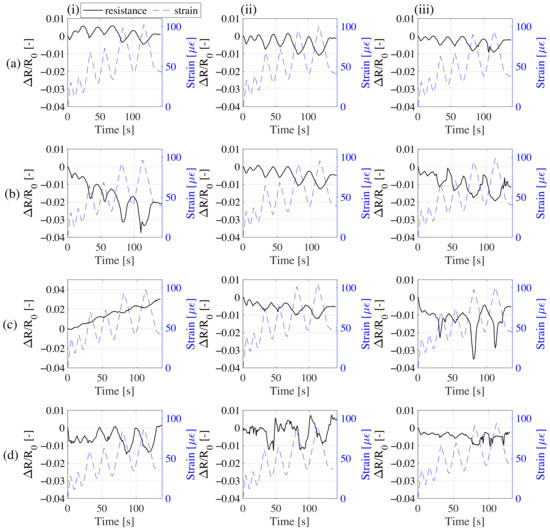 Relative change of resistance versus strain time histories each of the three samples belonging to the set of; (a) 1-32CMF0G; (b) 1-32CMF10G; (c) 1-32CMF20G; (d) 1-32CMF30G.