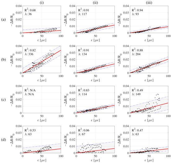 Discrete data points of fractional change of resistance vs. change of strain time histories with the best fitted line for all the samples; (a) 1-32CMF0G; (b) 1-32CMF10G; (c) 1-32CMF20G; (d) 1-32CMF30G.