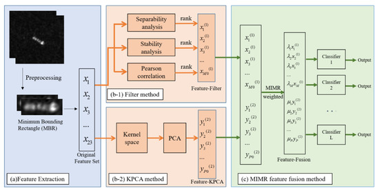 Based on the above analysis, we consider the feature extraction problem from two perspectives, one is to extract the most separable features, and the other is to extract the most robust and effective features. Therefore, the Filter method is applied to evaluate features and the features with better classification capabilities are selected into the feature subset. And the KPCA method is applied to retain the principal components of the original features and maximize the information representation efficiency of the feature subset to the target. Then, the maximum-information-minimum-redundancy (MIMR) method is utilized to perform reliable feature fusion to maximize information representation and minimize feature redundancy, and different classifiers are selected for ship classification. In Section 2, we will introduce the formation process of two different feature subsets after dimensionality reduction, including the Filter method and KPCA method. The feature fusion framework based on the MIMR method is presented in Section 3. In Section 4, we will first introduce our experimental dataset, and we will present the results of experiments. And Section 5 concludes our work and puts forward future research directions.