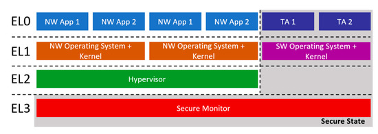 Furthermore, the ARMv8 architecture follows an exception model that is divided in four different privilege levels that follows the classic software segregation between application and operating system/kernel privileges [42]. In this way, it separates the system into relatively privileged abstractions. Each privilege level is denoted by its associated Exception Level (EL0, EL1, EL2, EL3) with EL0 being the lowest privileged while EL3 the highest. This model propagates throughout the normal and the secure world, affecting their applications and operating systems. More specifically, the unprivileged level of execution EL0 is where the user space applications reside like trusted and normal world applications, while the normal world and secure world operating systems and their kernels belong to EL1. The various hypervisors used for virtualization of the normal world or the secure world EL1 operating systems [43,44] reside in EL2 and can essentially allow the parallel execution of multiple EL1 operating systems but they cannot manage or manipulate the secure state of the system; that is, a transition between the secure and the normal world. This privilege is only allowed to the final and most privileged EL3 where the secure monitor (trusted firmware) is the only entity allowed in this exception level.