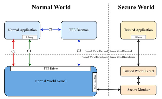 In Figure 2, there is a demonstration of how the two worlds are divided between them and their respective kernels. Each world includes its user-space and kernel-space for internal operations with the secure monitor being a part of the secure world. The communication between the two worlds can be implementation-dependent with three options being the most common which can be seen in Figure 2: (C1), a library is provided which directly communicates with the underlying TEE driver, (C2) the user application directly communicates with the TEE driver and (C3) there is a running daemon responsible for managing and forwarding requests to the TEE driver. Regardless of the chosen normal world implementation, the TEE driver will undergo any required procedures in order to create an SMC system call, which in turn hand over the execution to the secure monitor. Then, the secure monitor will assess the SMC and pass the execution to the trusted world kernel that will finally call the appropriate trusted application. It should be noted here that the two worlds, in order to communicate properly, have methods for sharing data either through small variables or shared memory objects.