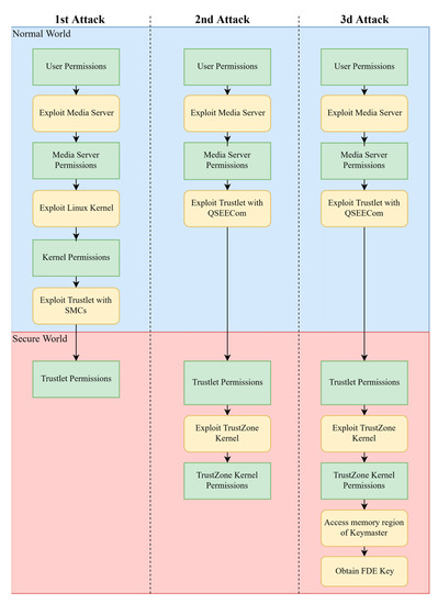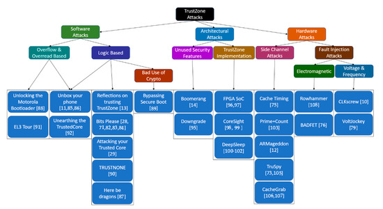 - Keltner, N. Here Be Dragons: Vulnerabilities in TrustZone. 2014. Available online: https://atredispartners.blogspot.com/2014/08/here-be-dragons-vulnerabilities-in.html (accessed on 4 January 2021).