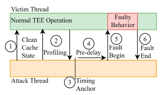 - Pengfei, Q.; Wang, D.; Lyu, Y.; Qu, G. Voltjockey: Breaching trustzone by software-controlled voltage manipulation over multi-core frequencies. In Proceedings of the ACM SIGSAC Conference on Computer and Communications Security, London, UK, 11–15 November 2019. [Google Scholar]