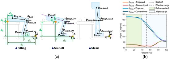From the inverse kinematics, θshank and θthigh at sitting can be calculated as follows (Figure 2a):