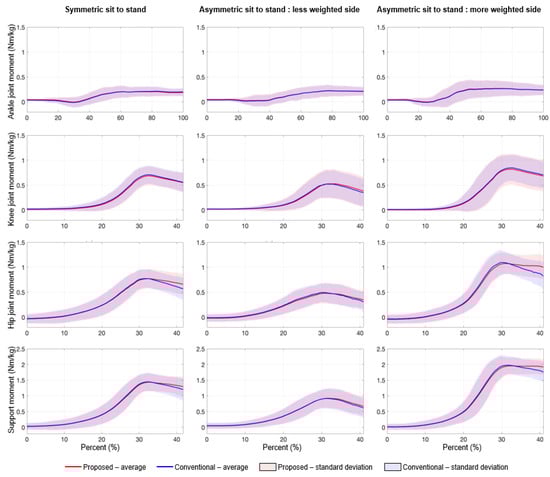 Comparison of joint moments and support moment obtained from the proposed system and conventional system with the motion capture system.