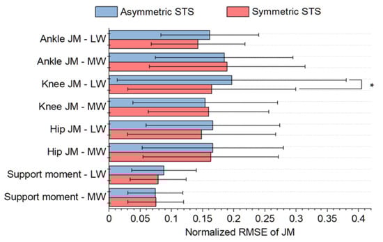 Comparison of RMSEs of normalized JMs and support moment between symmetric and asymmetric STS. Note that LW and MW denote the less weighted side and more weighted side, respectively. * indicate a significant difference (p < 0.05).