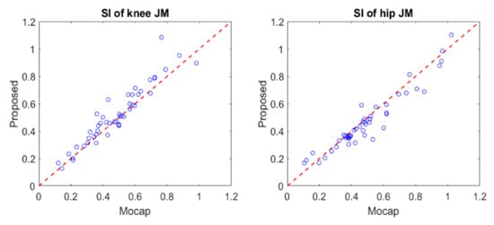 Figure 5 shows scatter plots of the SIs comparing the proposed system with the gold standard Mocap results. Note that those SIs were calculated for hip and knee joints during the asymmetric STS tasks [16,18]. The errors between the two SIs were quite small (0.055 ± 0.056 for knee joint and 0.051 ± 0.046 for hip joint), and the relationship between the two SIs was well fit to the unity slope line (R2 = 0.825 for knee joint, R2 = 0.947 for hip joint), as shown in Figure 5.
