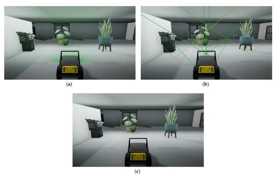 Overview of the simulation steps in the Unreal engine. (a) The impact locations of the initial rays cast into the environment (green dots). (b) The paths of selected rays as they propagate through the environment (colored lines). (c) The locations of reflected rays that have reached the sensor (red dots).