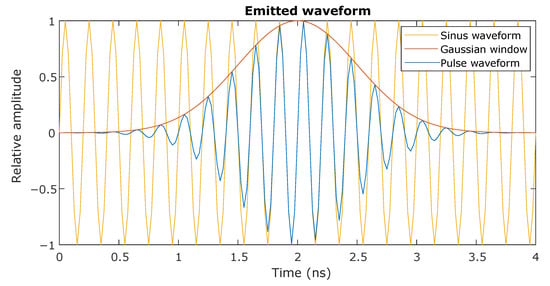 The first step in this process is to generate the emitted signal waveform, which only has to be done once for a specific sensor configuration. The signal can be chosen freely, but in this case we use one resembling that of the physical pulse-echo radar system, namely a Gaussian-modulated sinusoid;