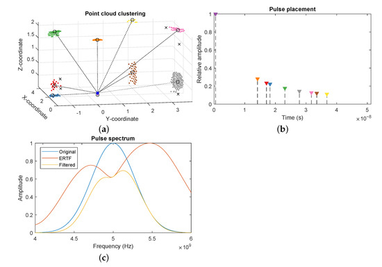 Steps of the reflector point cloud processing in MATLAB. (a) The point cloud received from the Unreal engine and clustered by the density-based spatial clustering of applications with noise (DBSCAN) algorithm. Clusters are color-coded, cluster centers are marked with circles, outliers are represented by crosses. The sensor location is draw as a blue square. (b) Pulse placement and amplitude in the generated signal according to the reflector location and ray attenuation. (c) Filtering of a pulse by the emitter and receiver for a specific incoming direction.