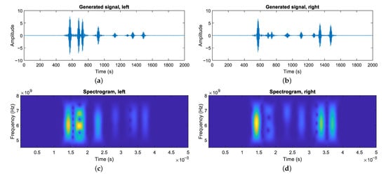 A complete measurement produced by the simulator. (a,b) The waveform measurements using the simulated radar sensor in a virtual environment for the left and right channel. The initial pulse is omitted for improved visibility. (c,d) The spectrogram representation of the signals.