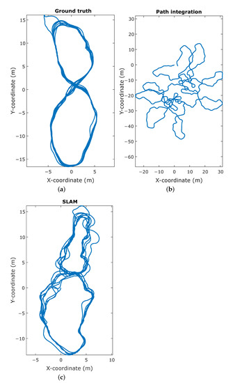 Comparison of the trajectories in the simultaneous localization and mapping experiment. (a) The ground truth vehicle trajectory, obtained directly from the simulation engine. (b) The trajectory as calculated by integrating the velocity commands given to the vehicle. (c) The trajectory reconstructed by the simultaneous mapping and localization (SLAM) algorithm, given the velocity inputs and simulated measurements.