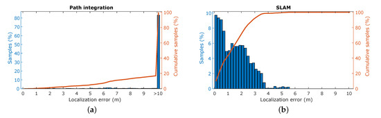 Simultaneous localization and mapping metrics. (a) The distribution of the positional error for the path integration compared to the ground truth. (b) The distribution of the positional error for the SLAM trajectory compared to the ground truth.