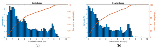 We again perform an experiment in which the robot is set to wander the environment. We then filter the incoming radar signals using each ERTF to obtain two sets of recorded signals and run the SLAM algorithm on both the data sets. The metrics of these experiments are shown in Figure 10. Here, a modest improvement in localization can be discerned when comparing the varying ERTF to the static-lobed ERTF. Additional metrics further confirm the hypothesis of improved place recognition by using an ERTF with increased spatial variability; the average error decreases by 11%, from to , and the 95th percentile localization error decreases from to .