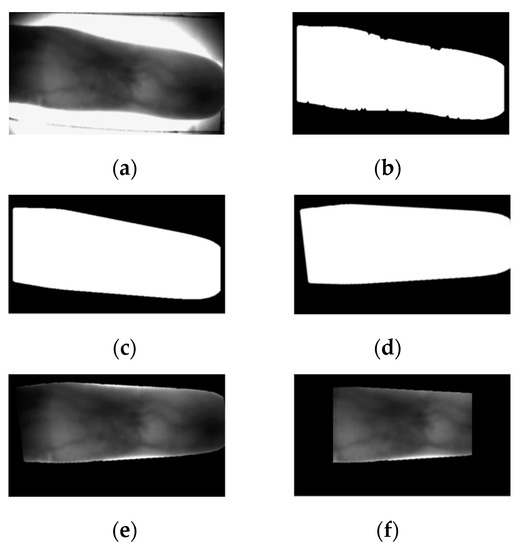 Sample images of each preprocessing stage: (a) original image, (b) image obtained after Sobel edge detection and thresholding, (c) image after edge smoothing, (d) image after in-plane rotation compensation, (e) finger-vein image obtained by region of interest (ROI) mask, and (f) finally cropped finger-vein ROI image.