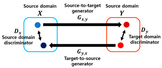 where G and D represent the generator and discriminator, respectively, and are the source image and target image selected in the domain, respectively, and is the total number of data of each domain. is a cycle-consistency coefficient; a value of 10 was used in this study. Processing heterogeneous data through domain adaptation, as proposed in this study, enables us to retain the shape information of a specific domain while generating new domain data through adaptation of the texture information of a different domain. Thus, for a proper mixture of shape information and texture information, cycle-consistency loss value and adversarial loss value were adjusted using .
