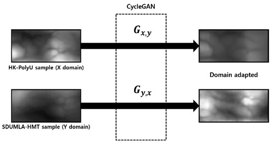 - Domain adaptation was performed through a CycleGAN so that the existing training-based finger-vein recognition method can handle unobserved data. Each finger-vein dataset has different numbers of classes. Therefore, we used CycleGAN, which can deal with unpaired datasets.
