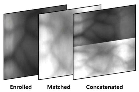 A composite image is generated using the domain adapted image [26]. It is generated for a matching case, and it maximizes the network utilization rate more than the feature-based Euclidean distance matching method used in conventional finger-vein recognition systems. For the feature-based Euclidean distance matching method, matching is performed using the features extracted before the fully connected layer in a trained CNN model for the finger-vein recognition system. Thus, a trained fully connected layer cannot be used. In contrast, when generating authentic and imposter matching images as composite images, all layers in the trained CNN model for finger-vein recognition including the fully connected layer can be used. Furthermore, a data augmentation effect is observed during training because composite images are generated for the number of matching cases, and it is more robust for noise than difference image-based matching [5]. As shown in Figure 5, a composite image is an image generated by having an enrolled image, a matched image, and a concatenated image in each channel. The concatenated image is created by resizing the enrolled image and the matched image into 1/2 size images and then concatenating vertically. As a result, a three-channel shape image is generated and input in the CNN classifier. The composite image-based method does not involve Euclidean distance calculation by a n-dimensional feature vector, thus requiring a shorter time during inference compared to feature distance-based matching.