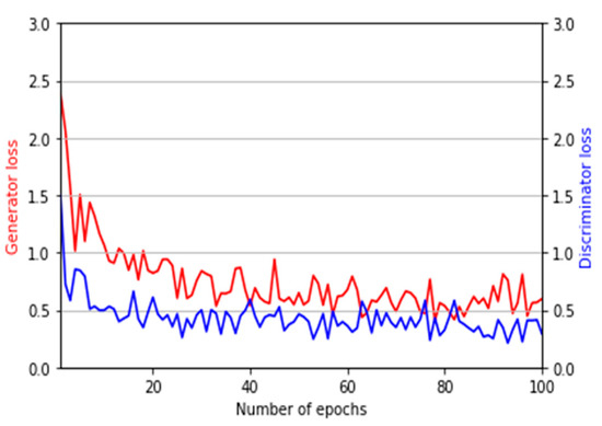 For the optimizer of the CycleGAN used for domain adaptation, the adaptive moment estimation (Adam) optimizer [37] was used. The initial learning rate was 0.0001; the exponential decay rate of the Adam optimizer was 0.9 for the first moment estimate and 0.999 for the second moment estimate. The learning rate strategies such as linear decay were not used. The model was trained for a total of 100 epochs. The discriminator was trained once for one mini-batch, whereas the generator was trained five times to solve the problem of the difficulty in training the generator of CycleGAN. Owing to this training strategy, the CycleGAN model used in this study was appropriately optimized for both the discriminator and generator. Figure 6 shows the loss graph of the generator and discriminator of the CycleGAN used in this study.