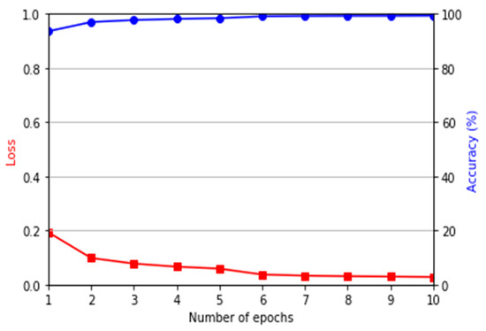 A transfer learning strategy was used for training the finger-vein recognition model. The fully connected layer of the original network fine-tuned with the ImageNet was replaced with a fully connected layer with two-dimensional output, thus freezing the previous convolutional layer part and using the fully connected layer in the domain adapted image for training. Figure 7 shows the loss and accuracy graphs of the DenseNet-161 used in this study. These graphs imply that the DenseNet-161 model has been appropriately optimized.